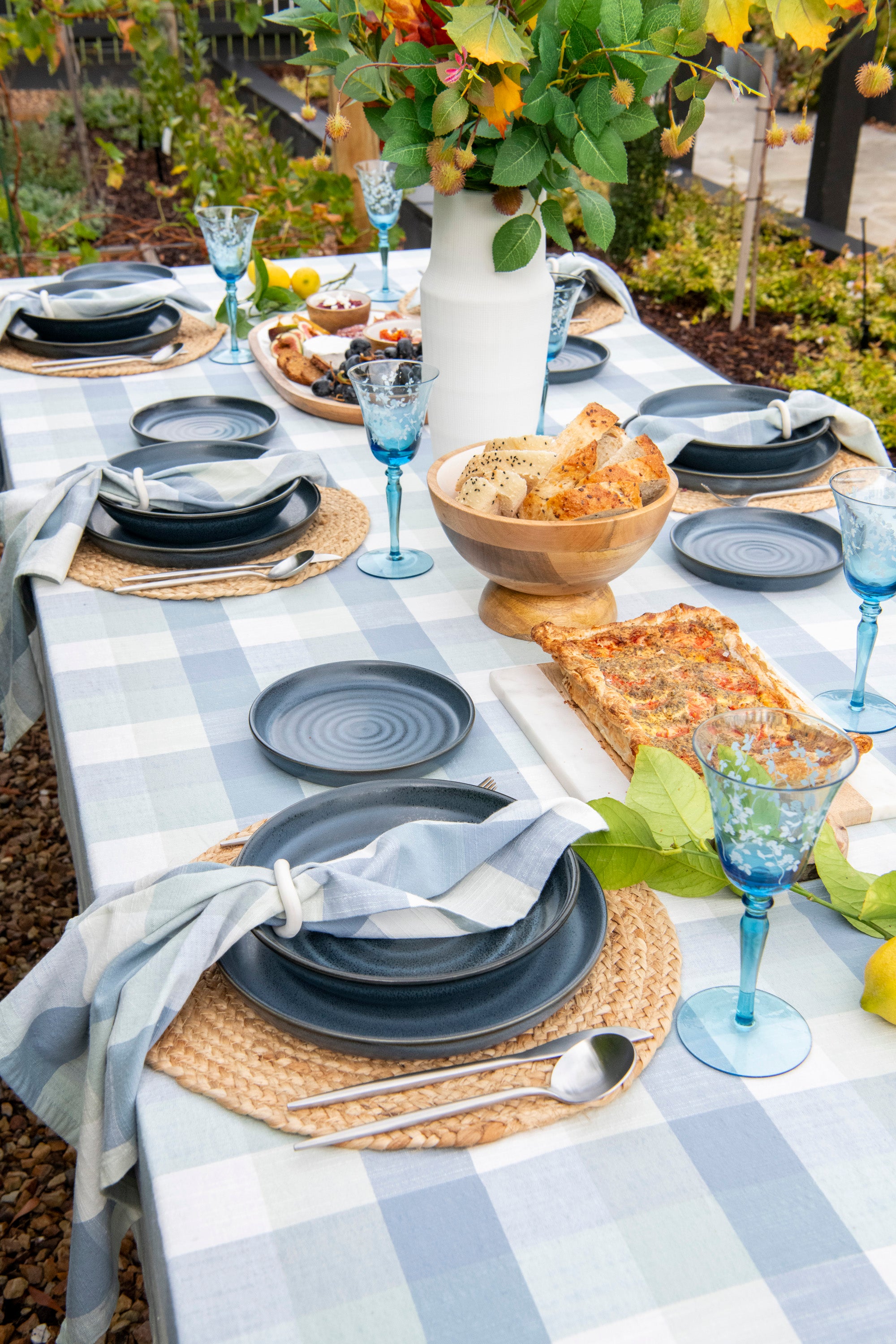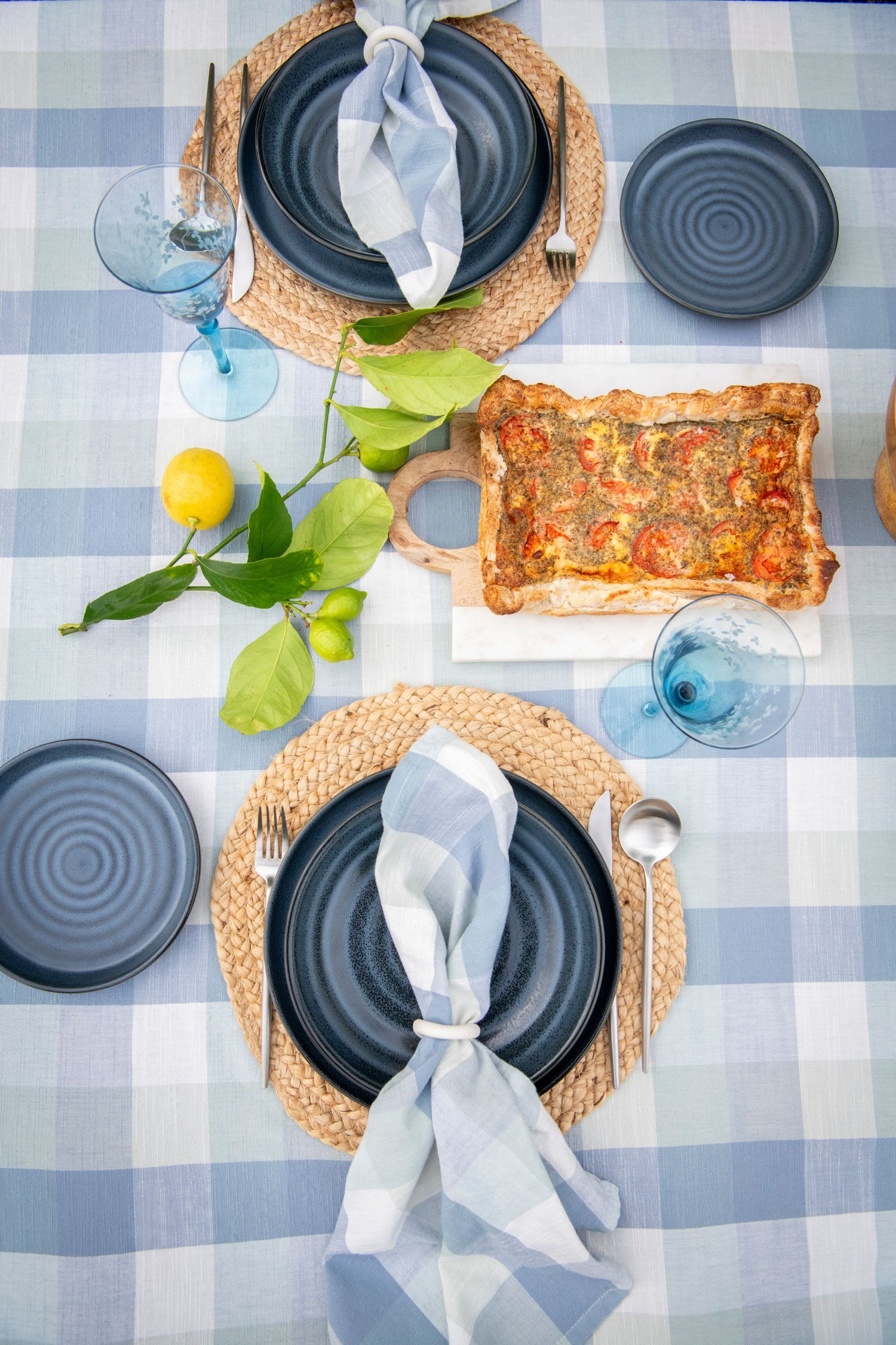 Blue Sky Gingham is a celebration of warmth, citrus trees, and slow moments. The gentle pattern of soft blue and white gingham creates a nostalgic, airy base, while grounding textures like jute and deep navy ceramics add richness and structure. Nestled among lemon trees, this tablescape feels both relaxed and elevated — casual enough for barefoot dining, refined enough to linger well into golden hour.