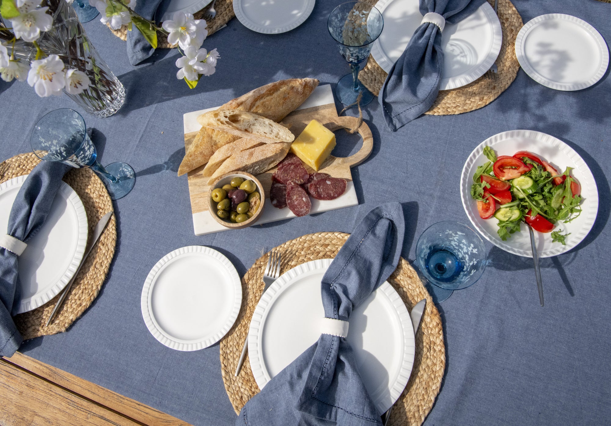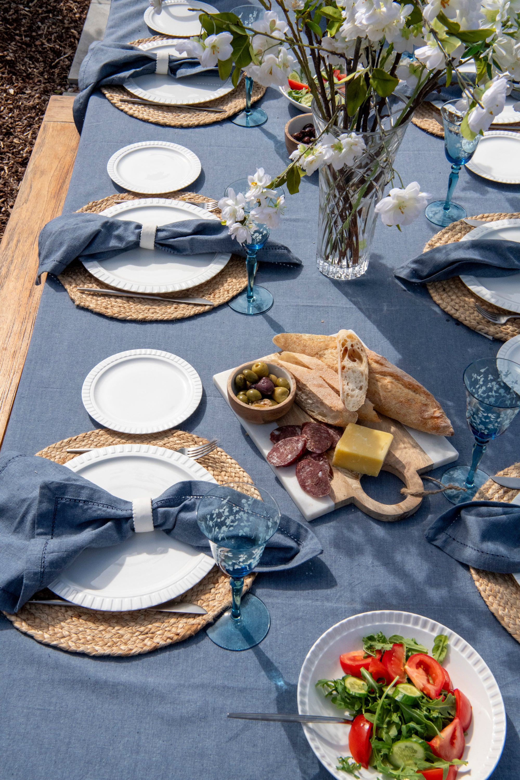 Balances deep blues and crisp whites contrasting beautifully with warm neutrals reflecting the essence of summer and warm nights for a relaxing gathering with family and friends.