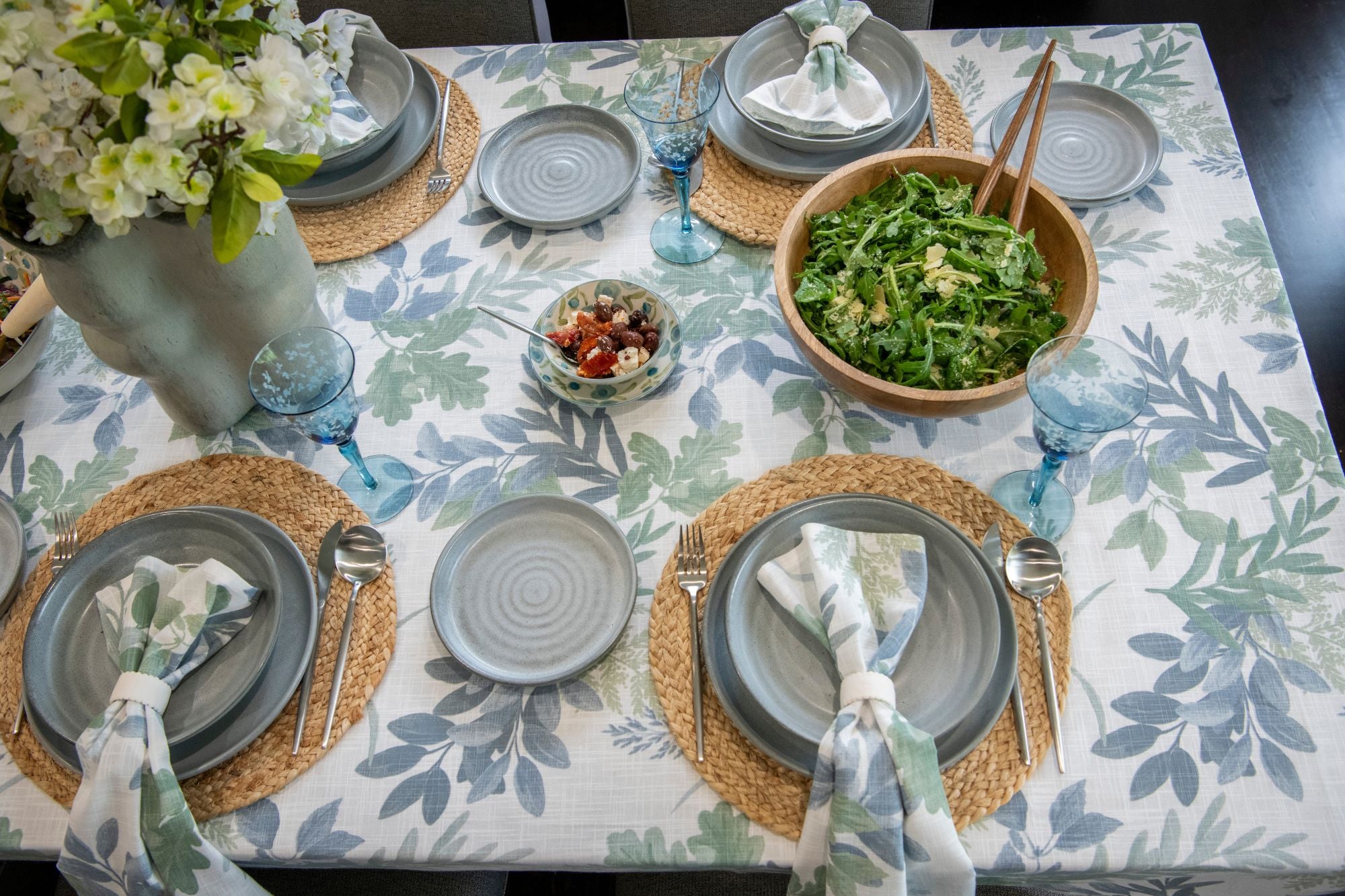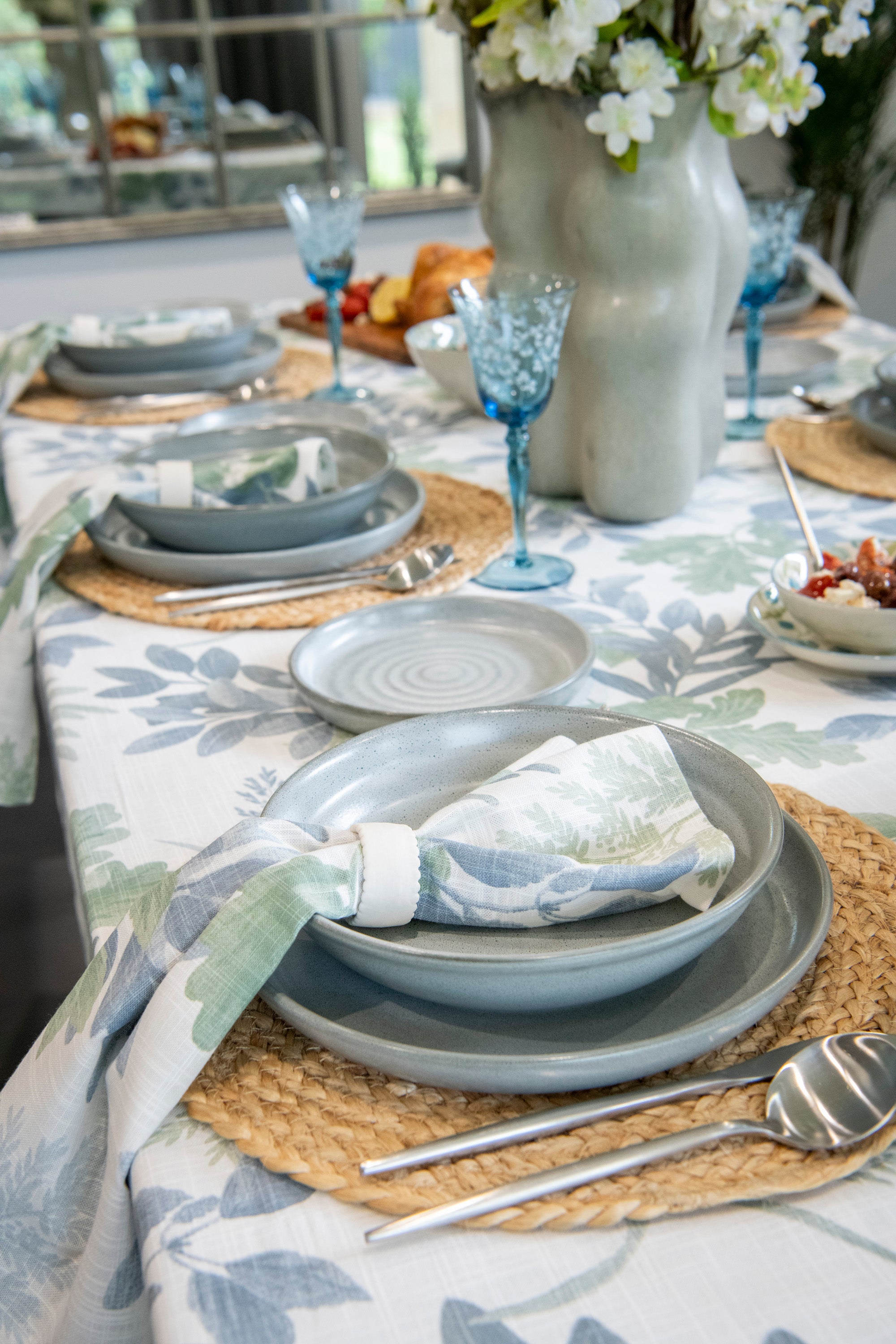 The Moss Meadow Napery Range features a gentle seafoam foliage pattern on a soft off-white cotton base. Lightweight, breathable, and easy-care, it brings a fresh, botanical touch to your table—perfect for everyday dining or relaxed get-togethers.