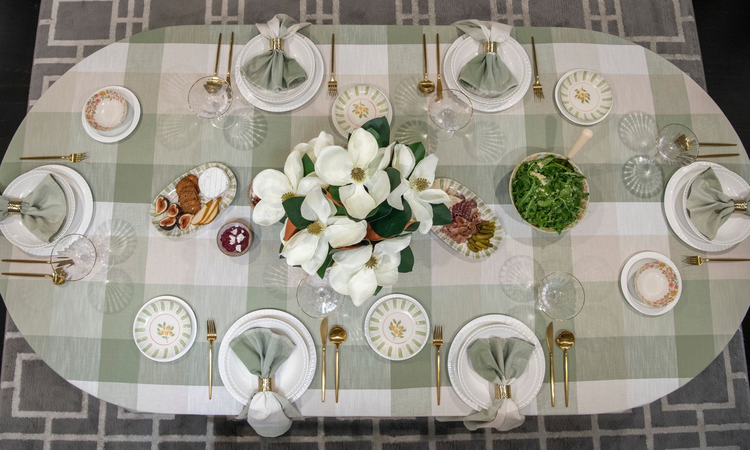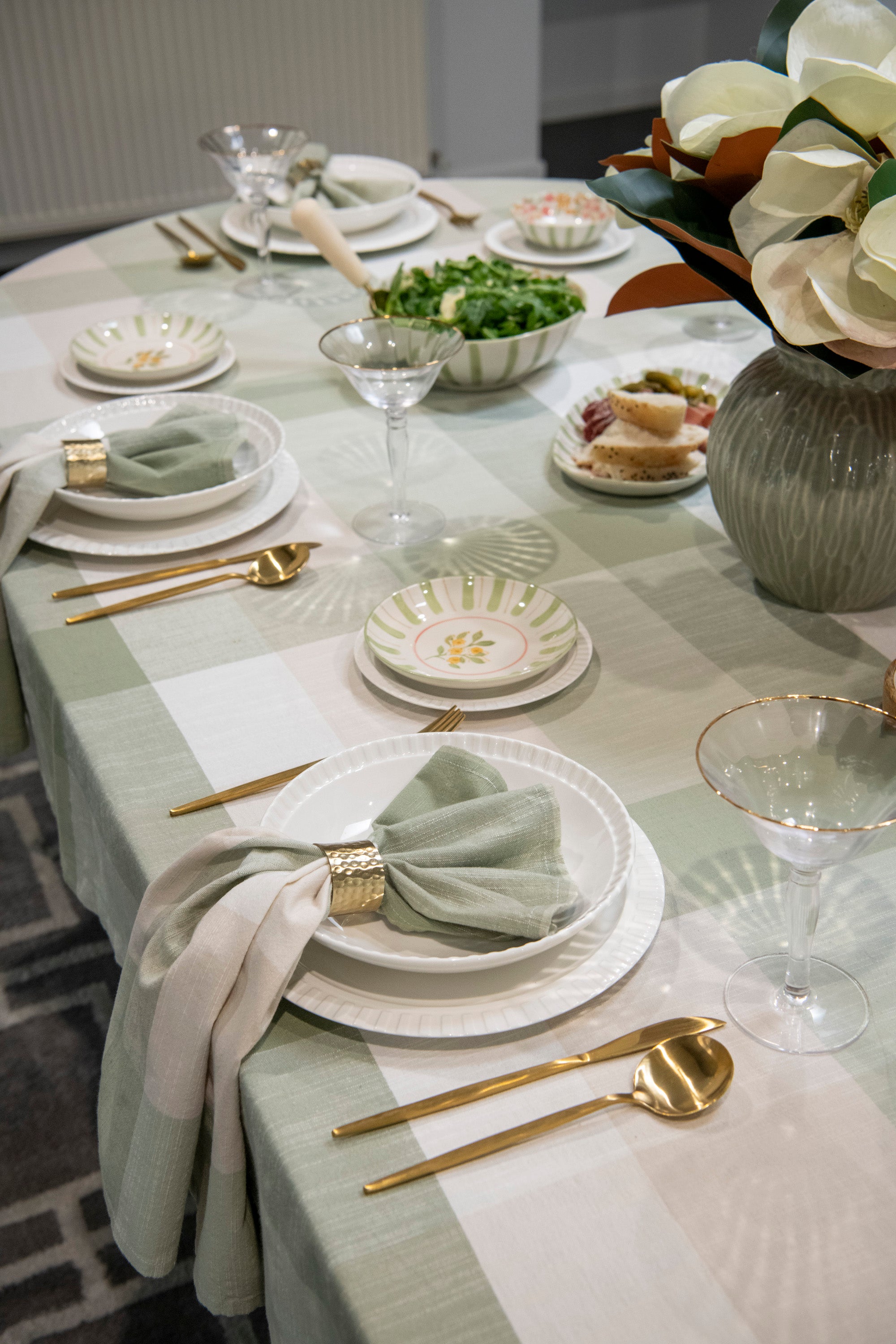 Olivewood Gingham is a joyful blend of garden charm and delicate refinement. The gingham cloth — in hues of soft green, blush pink, and warm white — sets a cheerful yet restrained tone. Crisp white ceramics and dainty dishware elevate the setting, It’s the kind of table that feels both styled and spontaneous — perfect for a brunch or big breakfast feast.